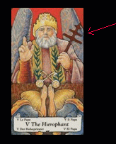 "AUM" please click here. The symbol of the chakra trinity- the hip chakras, shoulder and temple chakras can bee seen in the Hierophant card of the Tarot Trump in many decks, symbolized by the scepter in the hand of the Hierophant. |
