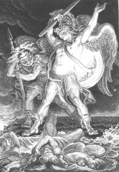 ठूलो चित्रको लागि यहाँ क्लिक गर। यहाँ "Paradise Lost" को महाकाव्यबाट एडवर्ड बर्नी द्वारा पुरानो चित्र छ।